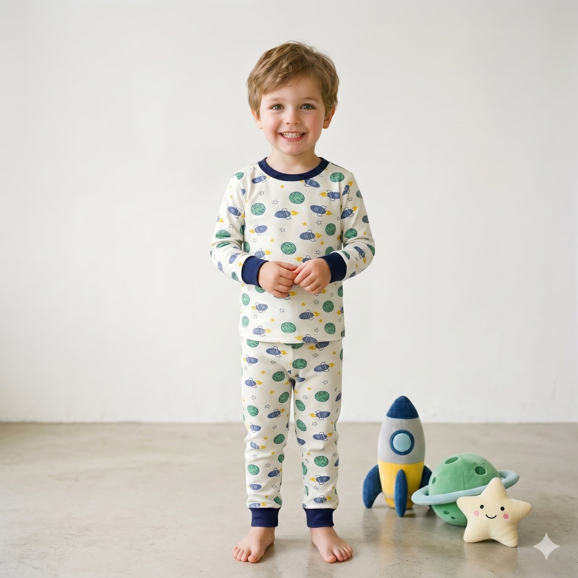Finished with a vibrant all-over print of soaring rockets, green planets, and twinkling stars, this boys’ cotton pajama set brings a fun, adventurous feel to his nightwear collection. Whether he’s winding down after a day of discovery, lounging at home on weekends, or packing for a cosmic getaway, this matching sleepwear set combines playful style with everyday comfort.