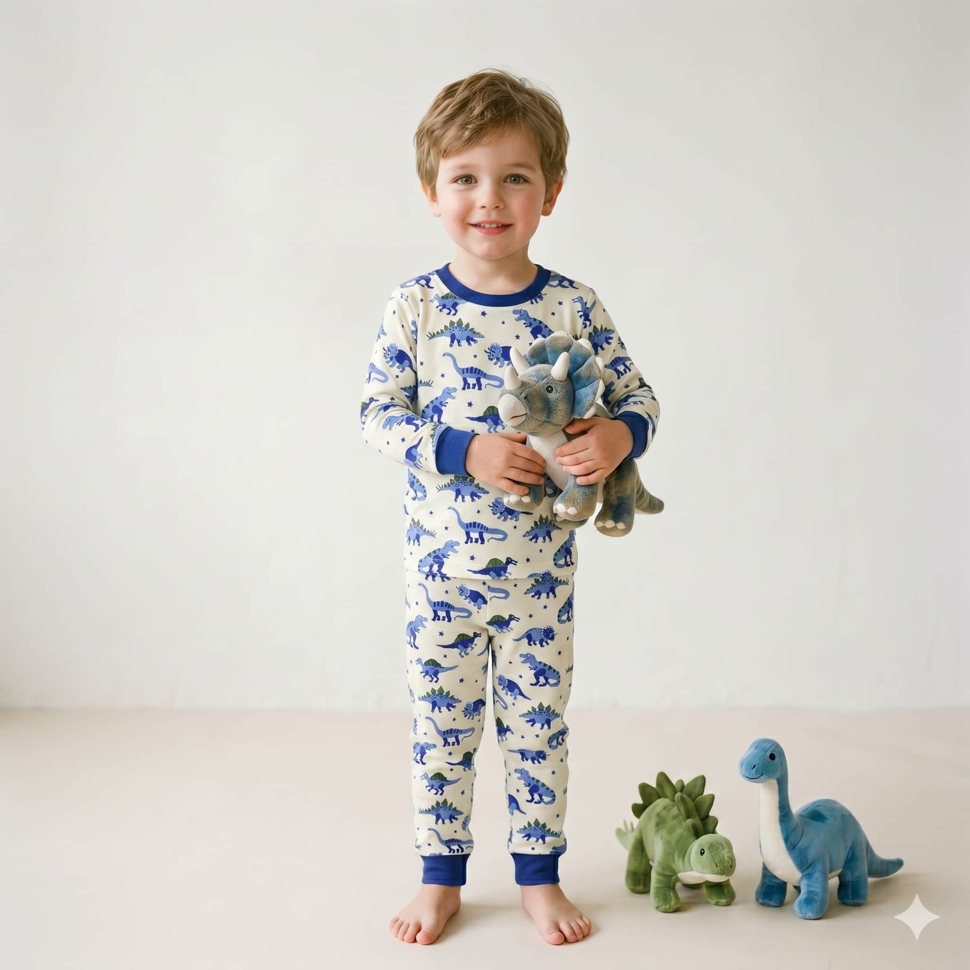 Finished with a vibrant all-over print of favorite dinosaurs like the T-Rex, Stegosaurus, and Triceratops, this boys’ cotton pajama set brings a fun, modern feel to his nightwear collection. Whether he’s winding down after a long day of play, lounging at home on weekends, or packing for a cozy getaway, this matching sleepwear set combines timeless style with everyday comfort.