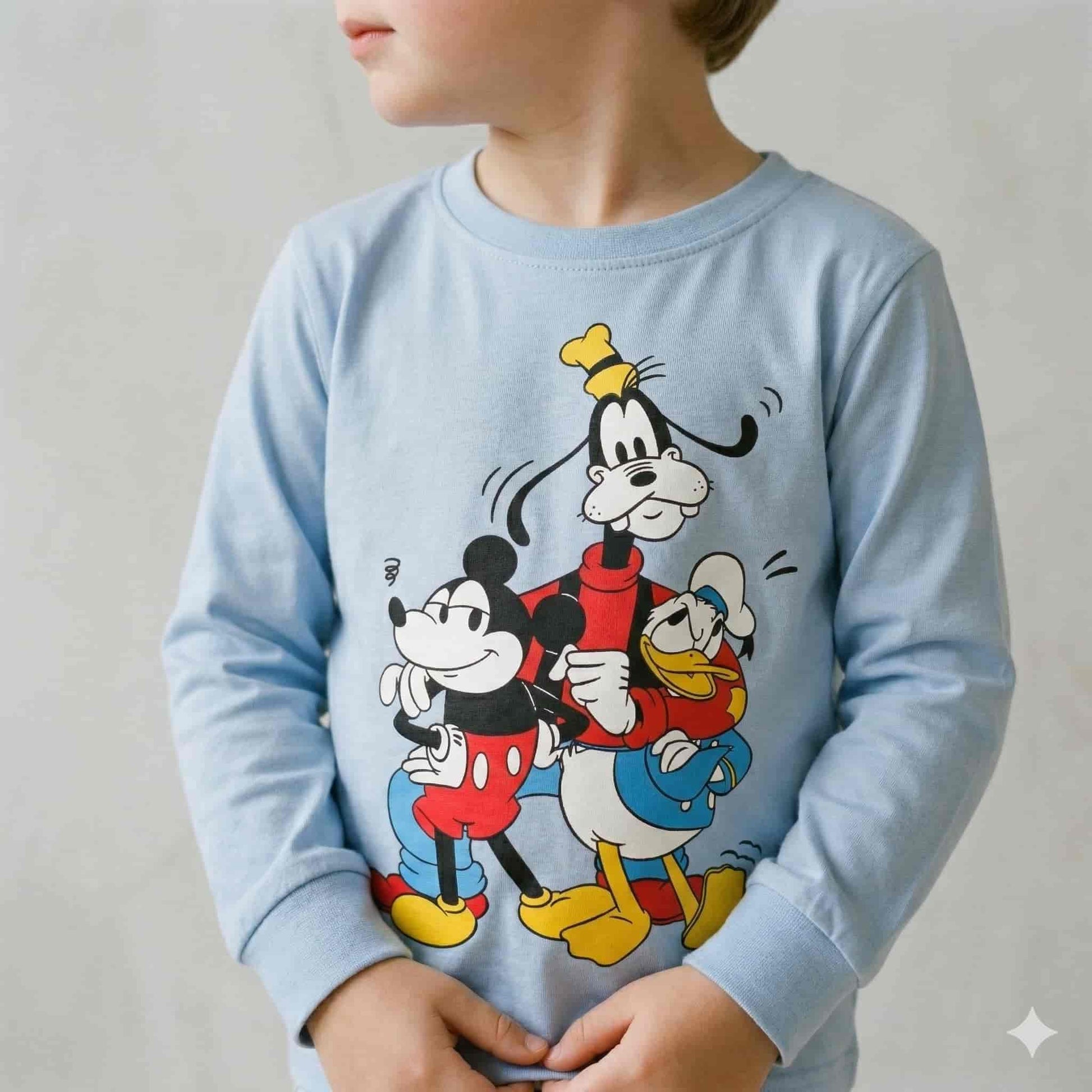 Featuring adorable Disney character prints including Mickey Mouse, Donald Duck, and Goofy, this pajama set brings a fun and cheerful vibe to your child’s sleepwear collection. The light blue top paired with printed bottoms adds a vibrant and playful look that kids will love.